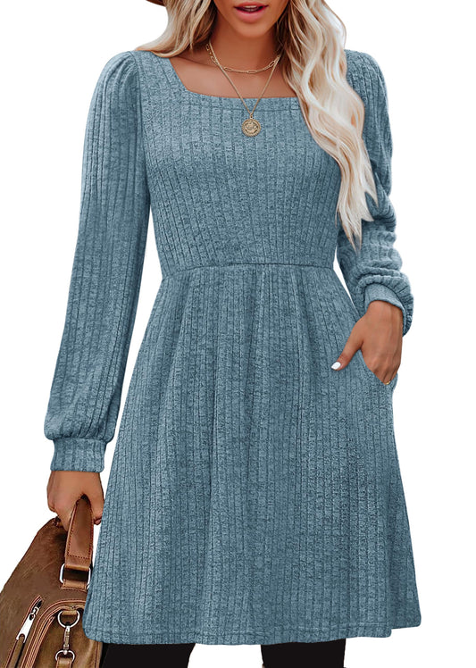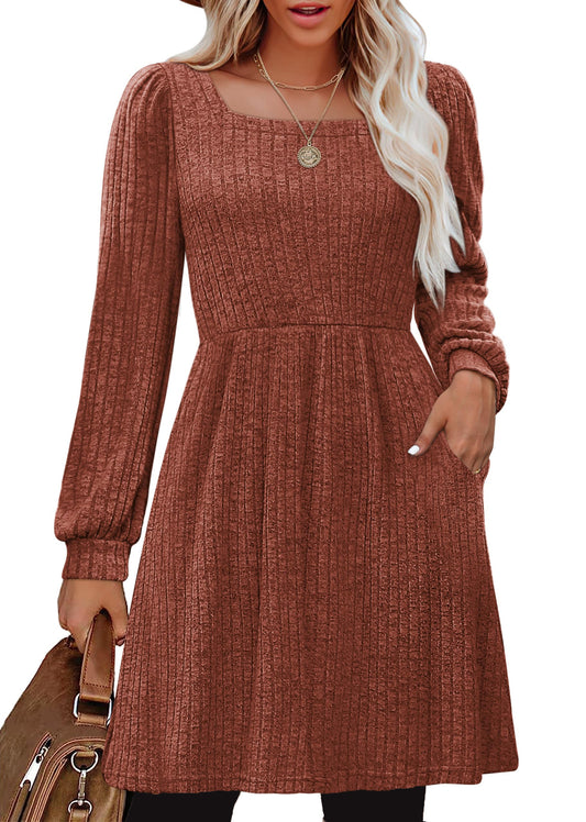 SHINE UP Dresses for Women Fall Square Neck Long Sleeve Knee Length Dress with Pockets